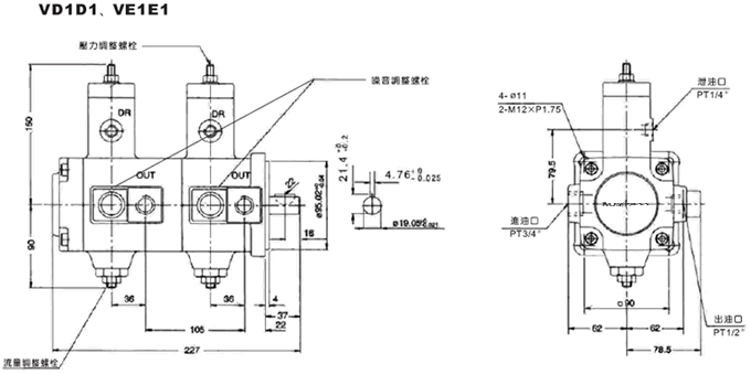 | 型號說明 | 排量 mℓ/rev | 前泵壓力調(diào)整范圍 MPa | 后泵壓力調(diào)整范圍 MPa | 安裝方式 |